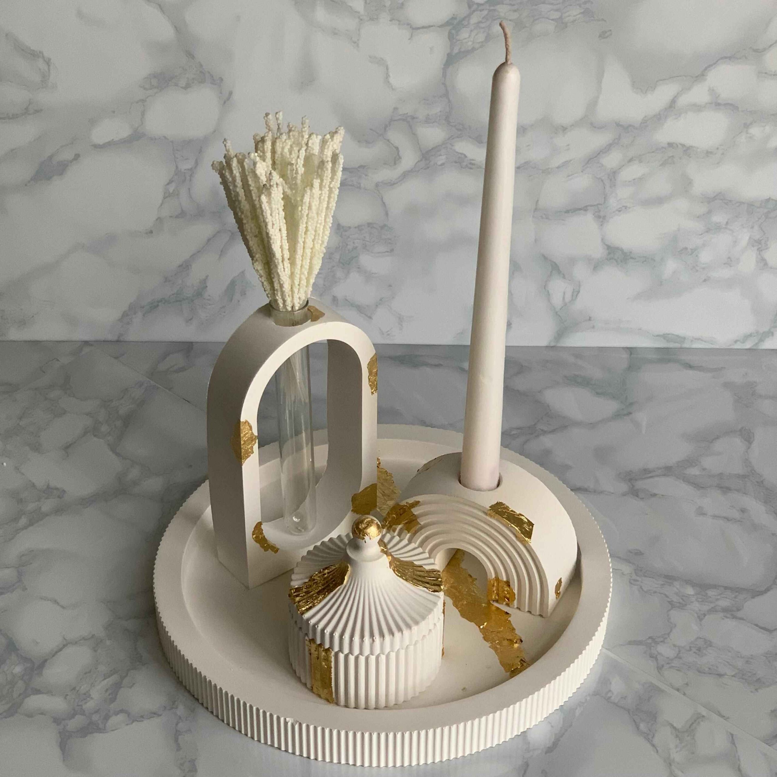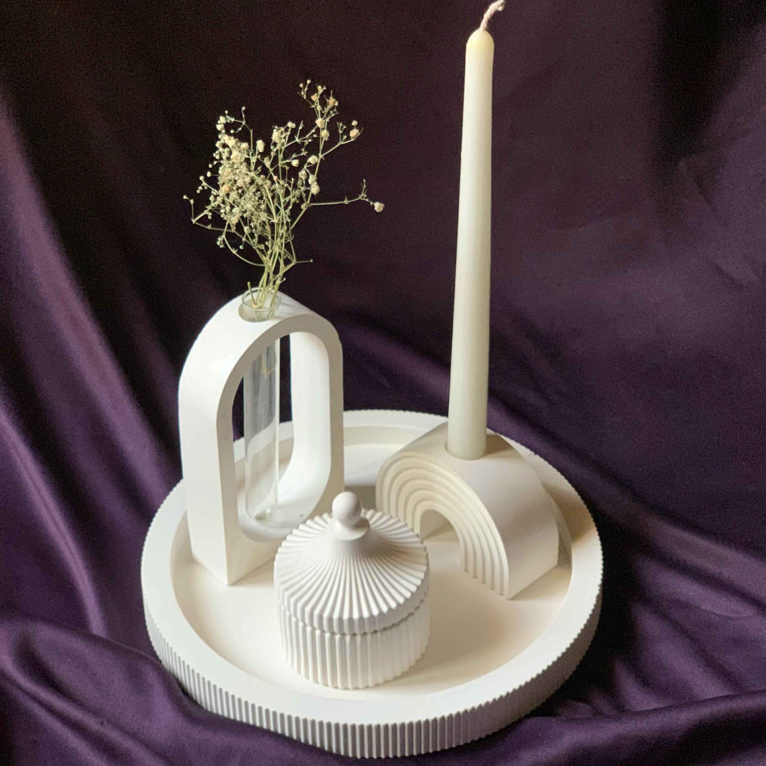 Set Includes: Serenity Tray (10 x 10 inches), Bloom tube Vase (4 x 7 inches), Mystique Jar (empty) (4 x 3 inches), Tapper Candle with stand (Scented)