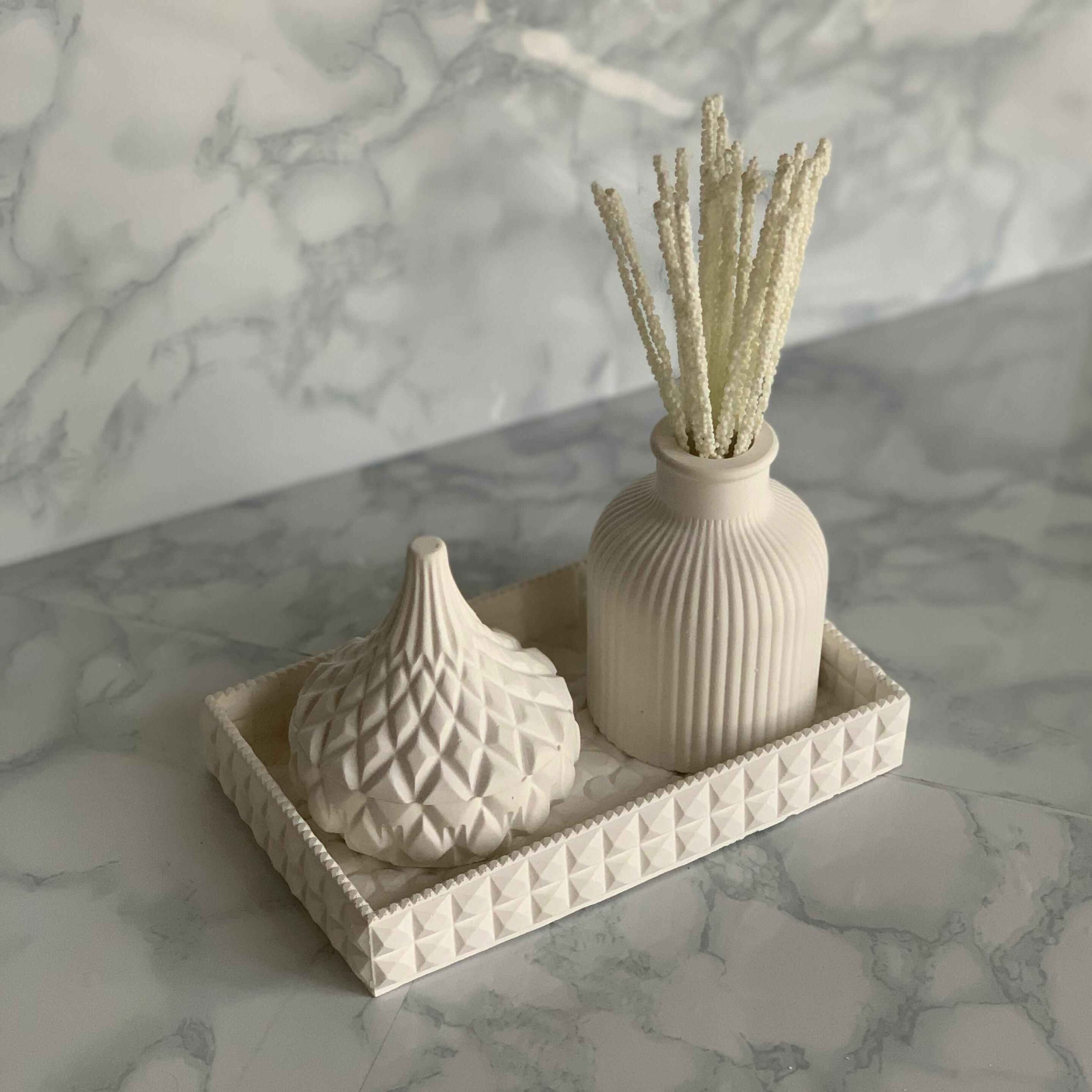 Versatility: Ideal for a variety of settings, this Decoration Set effortlessly elevates coffee tables, mantles, or sideboards. The tray organizes small items, the vase brings a touch of nature, and the scented candle adds a warm and welcoming atmosphere.