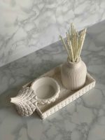 Coordinated Aesthetic: Each element in this set is thoughtfully selected to create a cohesive and visually pleasing arrangement. The Pebble Tray provides a chic foundation, the Vase introduces timeless charm, and the Jar contributes both style and fragrance, resulting in a unified and inviting decor ensemble.